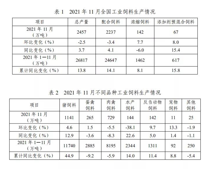 2021年1—11月,全国工业饲料总产量26817万吨,同比增长13.8%。其中,猪饲料产量11740万吨,同比增长44.9%;水产、反刍动物饲料产量分别为2344万吨、1311万吨,同比分别增长14.0%、11.4%;蛋禽、肉禽饲料产量分别为2885万吨、8195万吨,同比分别下降9.2%、5.9%。