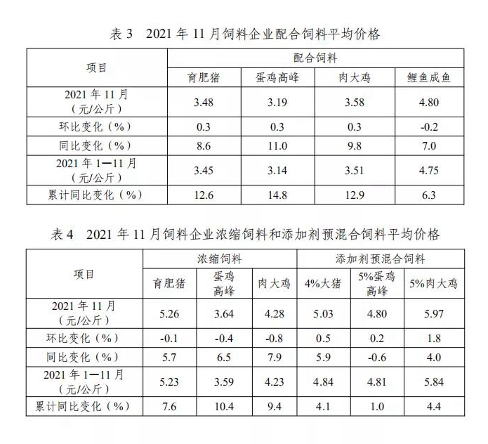 2021年11月,主要配合饲料、添加剂预混合饲料产品出厂价格环比稳中小幅增长,主要浓缩饲料产品出厂价格环比下降。由于主要原料价格与去年同期相比仍处高位,推动产品出厂价格同比继续增长。
