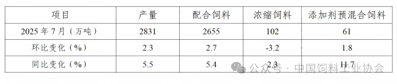 表1 2025年7月全国工业饲料生产情况